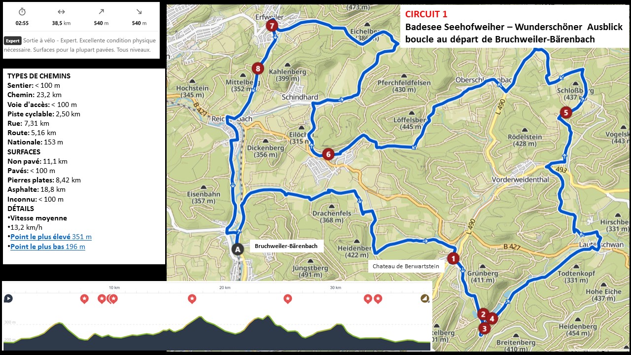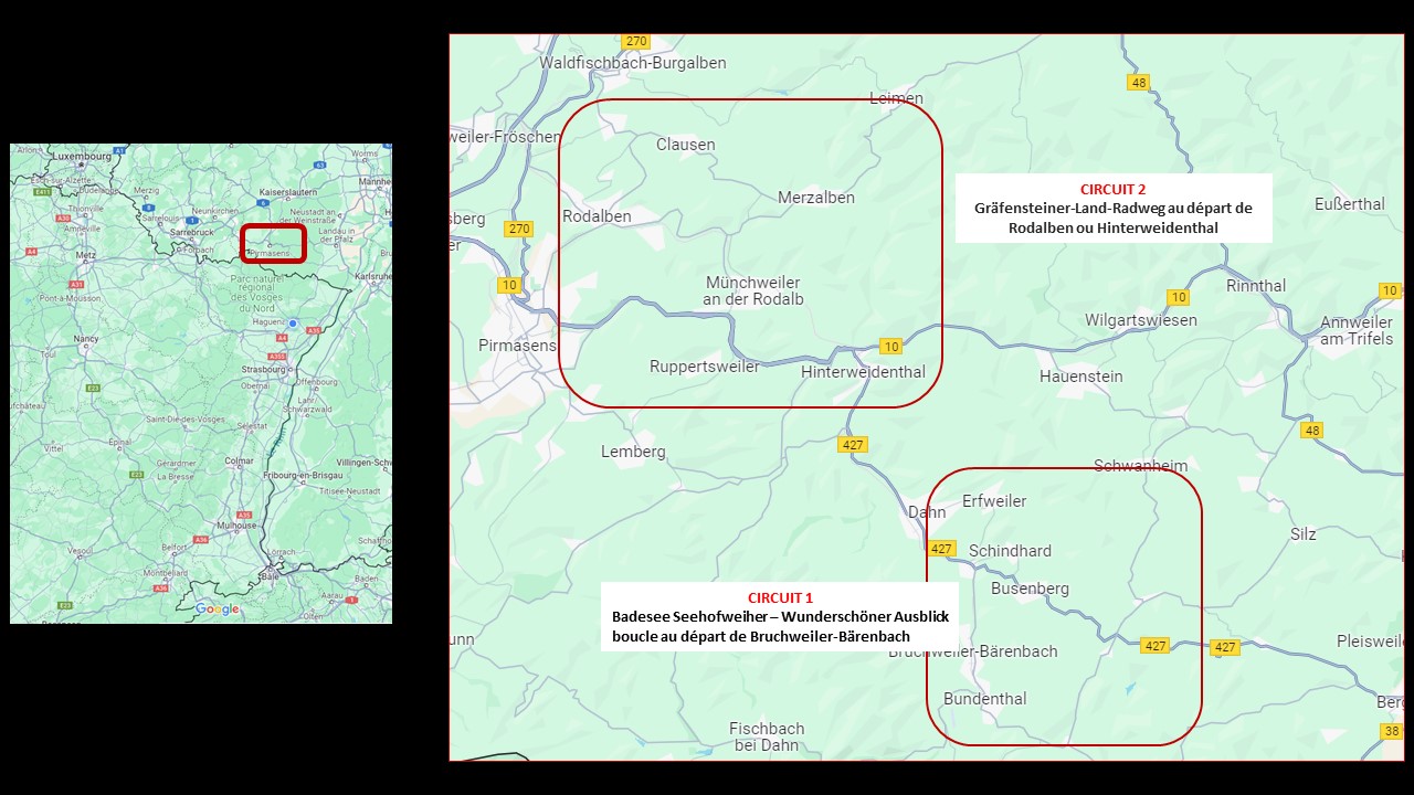 Vèlo 03/2024Ce sont 2 parcours magnifiques, de difficulté moyenne et pratiquement toujours sur des voies indépendantes souvent des “Schotterweg”et sans voitures. Les 2 balades se situent aux environ de Dahn non loin de la frontière française et sont inférieures à 50 km mais il faudra entre 4 et 5 heures pour les faire surtout si on prend le temps de visiter les 2 beaux châteaux sur le parcours. Montée de temps en temps un peu difficile mais cela ne dure pas.