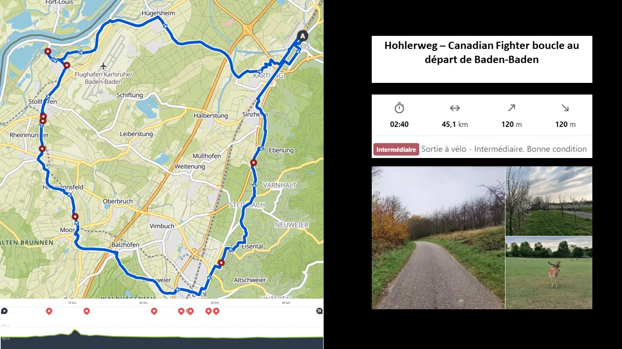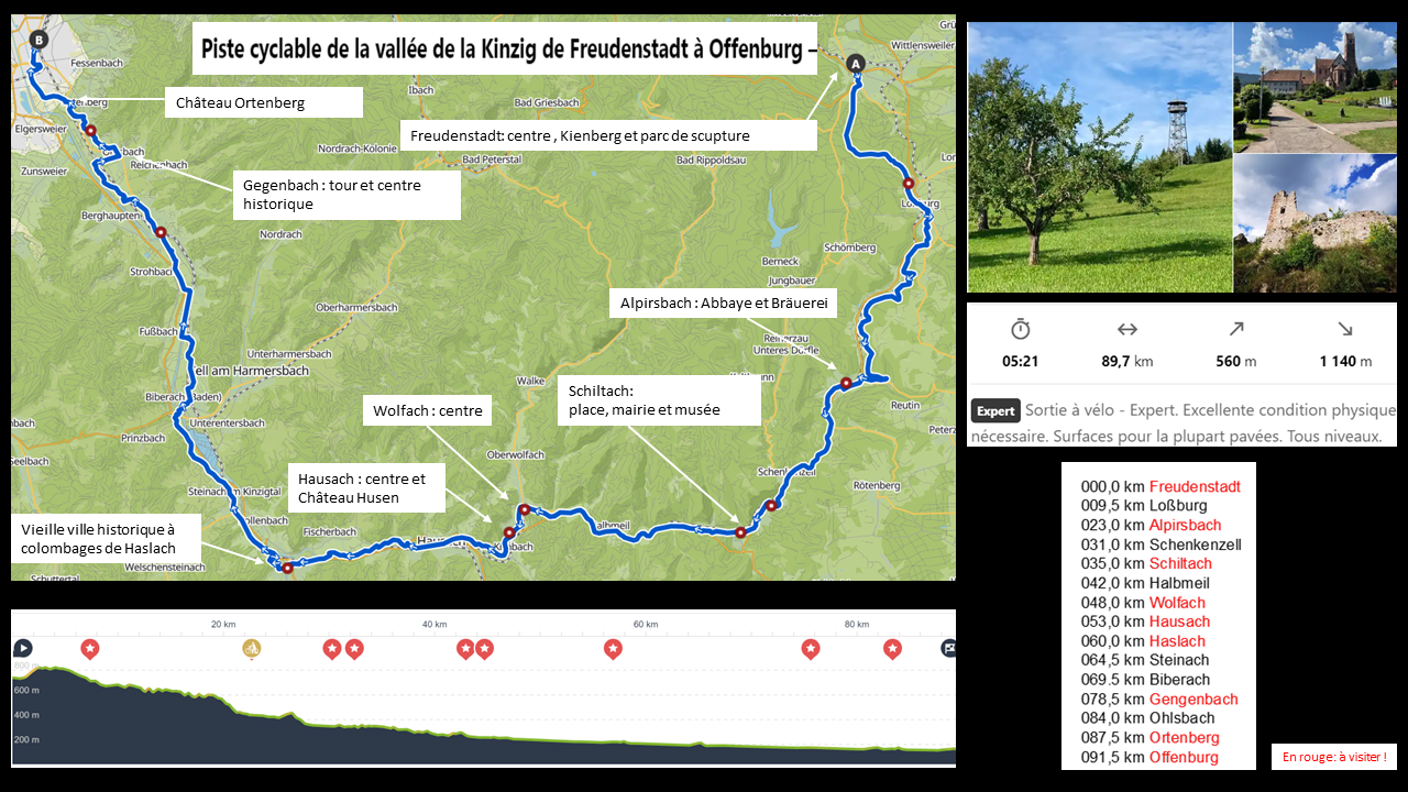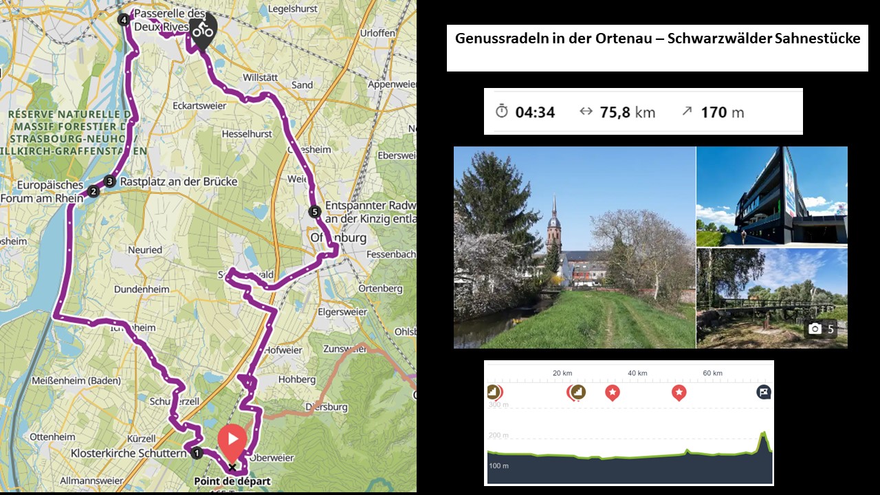 Vèlo 03/2024Ce qu’il y a de formidable en Allemagne quand vous faites du vélo c’est que vous n’êtes jamais sur des routes avec des voitures . Les 2 parcours en sont une démonstration. L’un long (70 km)mais varié part de Kehl, passe à Offenbourg et Frisenheim, puis longe le Rhin jusqu’à Kehl. L’autre plus court part de Baden et parcourt l’Ortenau en revenant aussi par le Rhin. Le troisième est un “must” relie Freudenstadt en altitude à Offenburg , c’est long mais vraiment très intéressant et plaisant.