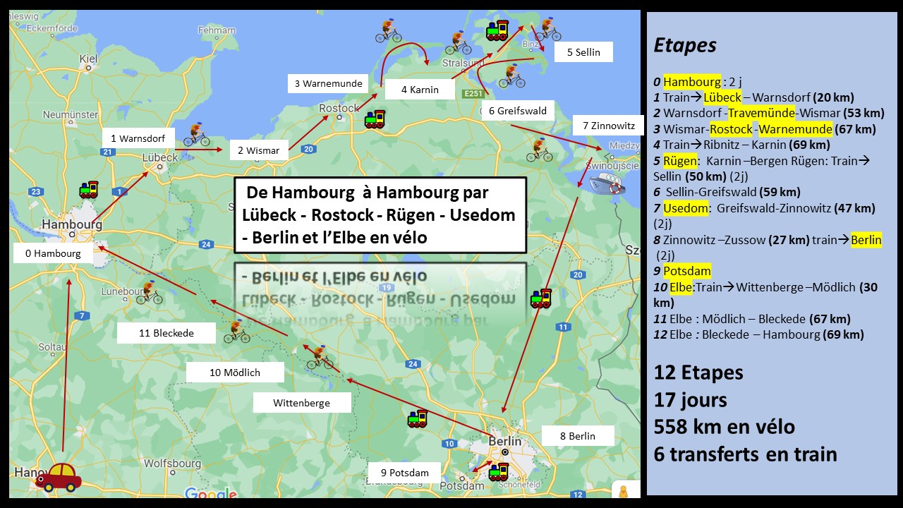 Ce parcours permet de longer la mer baltique par l’ “ex-DDR” , puis de visiter Berlin et de revenir sur Hambourg par les bords de l’Elbe. Les pistes cyclables sont présentes partout et on a joué avec le ferry et le train pour optimiser notre parcours. C’est facile, agréable et même reposant le long de l’Elbe…