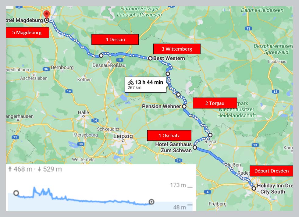 - Pistes cyclables et routes excellentes; navigation par Google maps. On roule de part et d’autres de l’Elbe car il y a 2 possibilités (comme à Paris la rive G et la D); il y a pas mal de choses à voir et à visiter mais pas forcément sur le bon côté du fleuve et pas forcément en accord avec le timing….