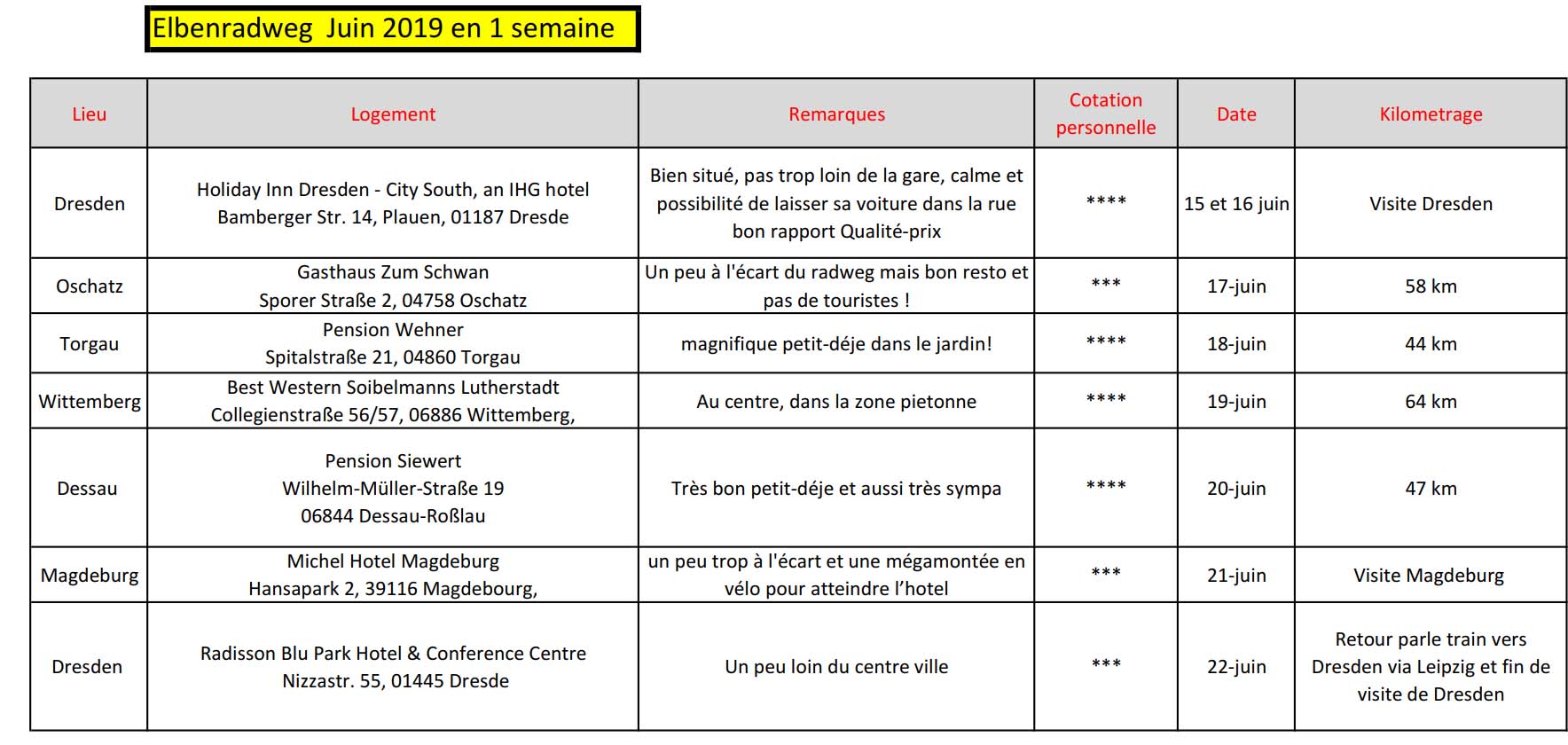 - l’hotel à Dresden est choisi dans un endroit calme de manière à pouvoir laisser la voiture une semaine sans problèmes le long d’un trottoir et est situé non loin de la gare pour le retour. (Holiday Inn parfait pour cela)