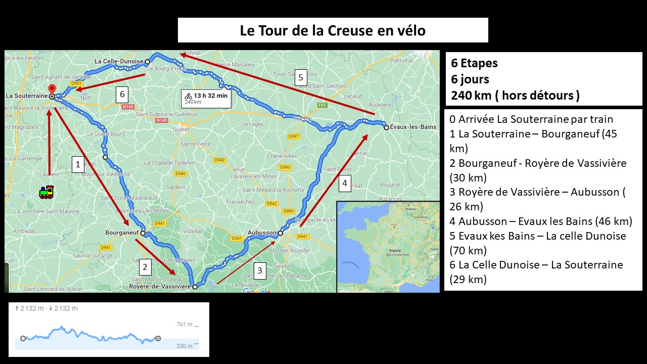 - on est arrivé en train de Bordeaux avec nos vélos (arrêt à la souterraine) et reparti de là vers Paris.