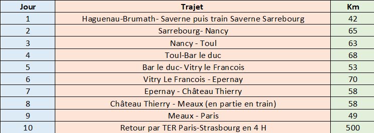 - Côté transport: Par ailleurs, le parcours est tel qu’il n’est pas difficile de prendre le train en cas de mauvais temps pour rejoindre une étape ( ce qui fut le cas en 2 occasions pour rejoindre Meaux et Sarrebourg). Le retour Paris-Strasbourg se fait par le TER fluo en 4 h de Paris, mais attention il faut réserver et accrocher les vélos donc en VAE impossible et en vélo de route hors gravel encore moins.