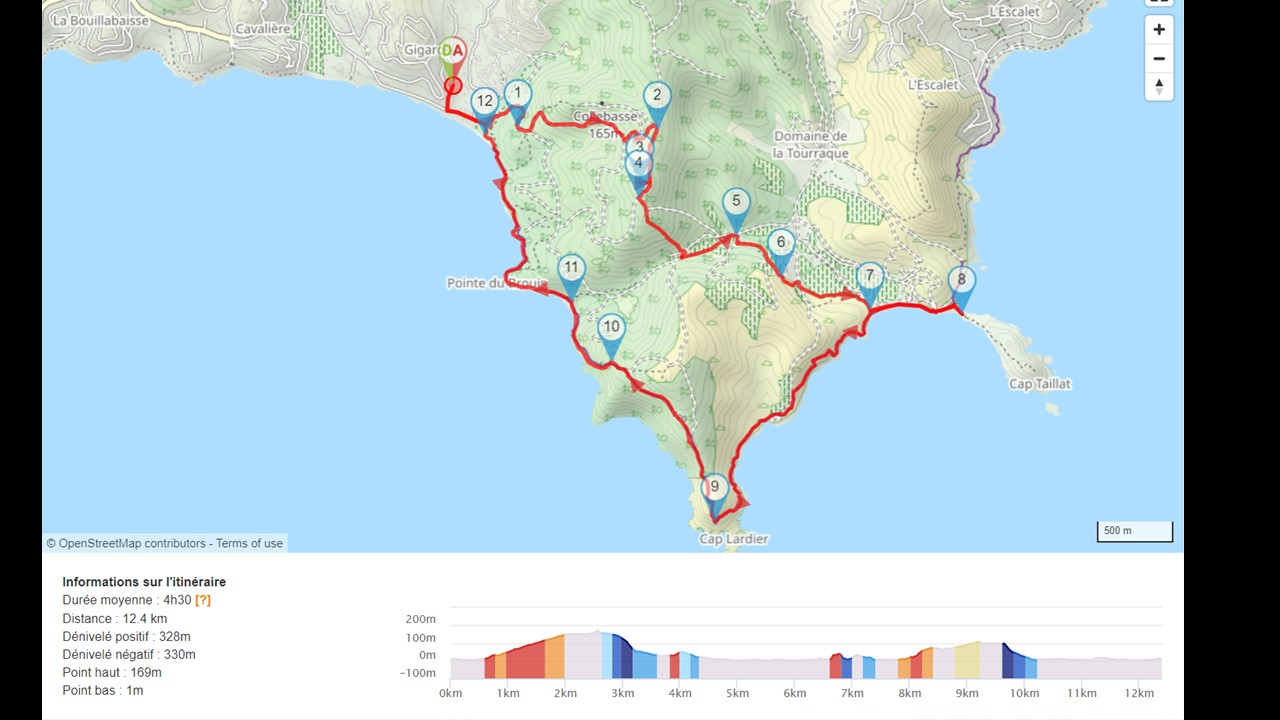 Magnifique randonnée après Cavalaire et non loin de Ramatuelle d’environ 4H au bord de l’eau mais avec de belles petites montées jamais très longues avec un stop au cap Lardier et un retour à partir du cap Taillat vers la plage de Gigaro