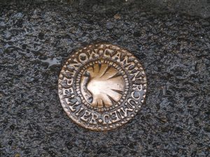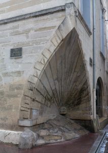 Noter 2 petites particularités : les clous du chemin de compostelle visible un peu partout sur la zone pietonne et ce “coin” évidé pour le passage des carrosses (jadis !)